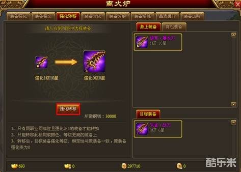 1、只有同职业同部位且强化等级≥1的装备才能进行强化转移;