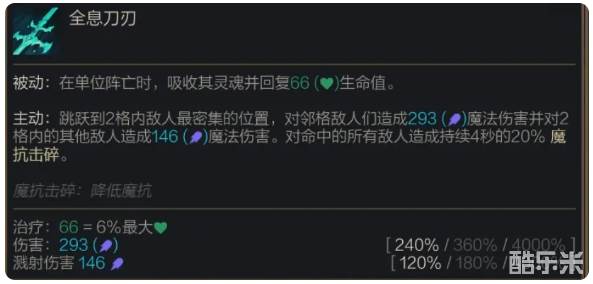 主动:跳跃到2格内敌人最密集的位置,对邻格敌人们造成(240%/360%/4000%)魔法伤害并对2格内的其他敌人造成(120%/180%/4000%)魔法伤害。对命中的所有敌人造成持续4秒的20%魔抗击碎。