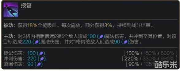 被动:获得18%全能吸血。每次施放,额外获得3%,持续到战斗结束。