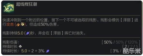 快速冲刺到一个附近的位置,留下一个不可被选取的残影。残影会模仿【泽丽】进行攻击(攻击力加成/攻速加成),但造成50%/50%/120%伤害。
