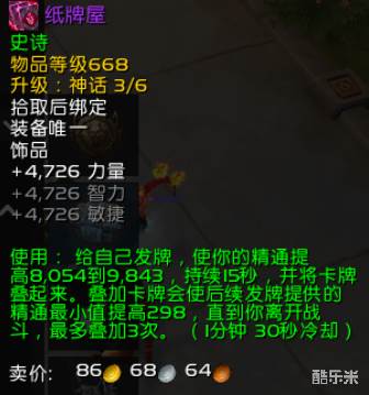 魔兽世界11.1版本上线带来了地心之战的第2赛季,在11.1版本也更新了许多新内容,纸牌屋是11.1版本新增了一个饰品,那么有不少小伙伴好奇11.1纸牌屋属性效果是什么,下面和酷乐米小编一起来看看吧