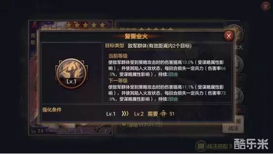 为什么说周姬一定是副输出位置呢,我们来看看她的自带战法。满级属性为使敌军群体受策略伤害+20%,并使其陷入火攻,每回合损失133%兵力,持续2回合。这个战法的伤害率和四大法相近(不过大法有几率打3个),同时又附带了增伤,最关键的是它不需要准备回合,发动几率高达45%,基本上可以保持全程给对面挂上增伤Buff,无论是对自己还是对队友的增益都很大。靠着这个集输出和辅助一体的自带战法,周姬在非大都督的吴弓队里相当吃香,不过需要注意的是她只能加成策略伤害,因此用纯谋将队配合她比较好。