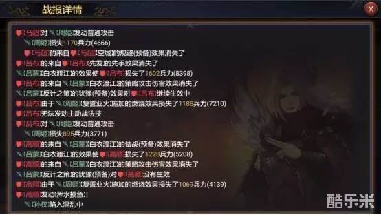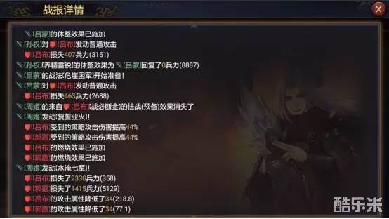 复誓业火虽然纸面上只有20%的加成,但实际效果高达44%,接近于神兵天降的加成值,又因为它是个无准备回合的主动技能,因此保持一个高覆盖率的加成还是很容易的,甚至可以让对方三人全部被打上Debuff。图中可以看出吃到复誓业火的加成之后水淹这种大法能打出相当高的伤害,尤其是对吕布这种弱智将一次就能吃掉五分之一以上的兵力。