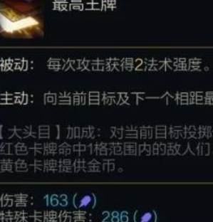 【大头目】加成:对当前目标投掷一张随机的特殊卡牌,造成(280%/420%/650%法术强度)魔法伤害。红色卡牌命中1格范围内的敌人们。蓝色卡牌造成其50%伤害的真实伤害。稀有的黄色卡牌提供金币。