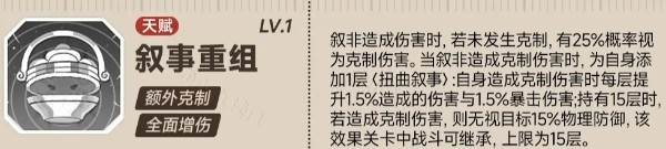 叙非对选定敌人造成383%的物理伤害,本次伤害触发【叙事重组]视为克制伤害的概率提升50%;造成克制伤害时,基于伤害30%对除目标外敌人进行溅射。