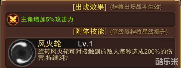 哪吒是一张橙色的攻击型神将卡,他的出站效果会增加主角的5%的攻击力作为橙色神将卡这5%的伤害很不错,而且他的与角色的神将合体技能叫风火轮,对接触到风火轮的敌人每秒造成200%的伤害。