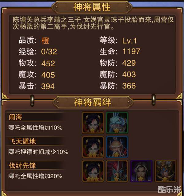 哪吒还是一名可以作为运镖的神将,为什么呢?因为他的羁绊关系中有一个是减少运镖时间10%的效果,押镖的时候选择哪吒押镖事半功倍。