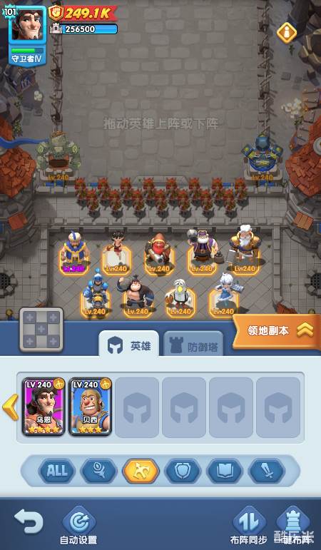 九位英雄,推荐首要安排推墙效果的英雄,并上阵两位单体英雄专攻精英怪及BOSS、三位群攻英雄清理小怪,以及一位阻挡英雄提供阻挡效果,最后根据具体情况上阵增/减益or控制属性英雄;
