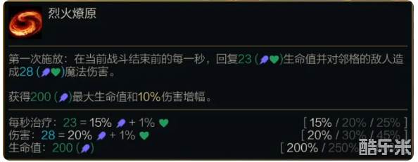 第一次施放:在当前战斗结束前的每一秒,回复(15%/20%/25%法术强度 +1%最大生命值)生命值并对邻格的敌人造成28(20%/30%/45%法术强度 +1%最大生命值)魔法伤害。