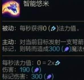 主动:对当前目标发射一支弩箭,造成(190%/285%/455%法术强度)魔法伤害并将其标记。如果其已被标记,则转而造成(300%/450%/720%法术强度)魔法伤害。