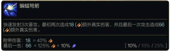 快速发射3次普攻。最初两次造成(40%攻击力)额外真实伤害,并且最后一次攻击造成(10%/15%/25%法术强度 + 125%攻击力)额外真实伤害。
