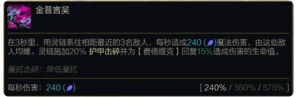 在3秒里,用灵链系住相距最近的3名敌人,每秒造成(240%/360%/575%法术强度)魔法伤害,由这些敌人均摊。灵链施加20%护甲击碎并为【费德提克】回复15%造成伤害的生命值。
