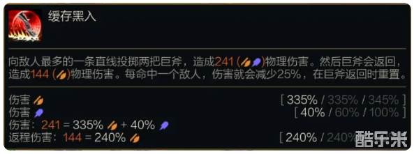向敌人最多的一条直线投掷两把巨斧,造成(335%/335%/345%攻击 + 40%/60%/100%法术强度)物理伤害。然后巨斧会返回,