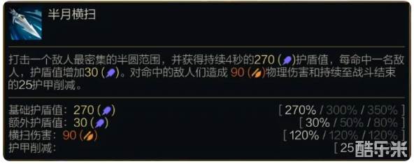打击一个敌人最密集的半圆范围,并获得持续4秒的(270%/300%/350%法术强度)护盾值,每命中一名敌人,护盾值增加(30%/50%/80%法术强度)。对命中的敌人们造成(120%攻击力)物理伤害和持续至战斗结束的 25 护甲削减。
