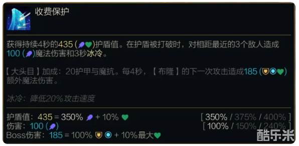 【大头目】加成:20护甲与魔抗。每4秒,【布隆】的下一次攻击造成(100%护甲 +100%魔法抗性 + 10%最大生命值)额外魔法伤害。