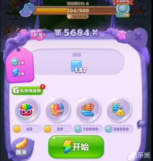 开心消消乐第5684关,初期优先破冰释放特殊动物与特效,中期利用魔法石和传送门动态改变布局,同时注意累积并适时引爆特效组合,如炸弹鸟与直线特效相结合,后期集中消除难点区域,灵活应对随机出现的障碍,下面和酷乐米小编一起来看看吧