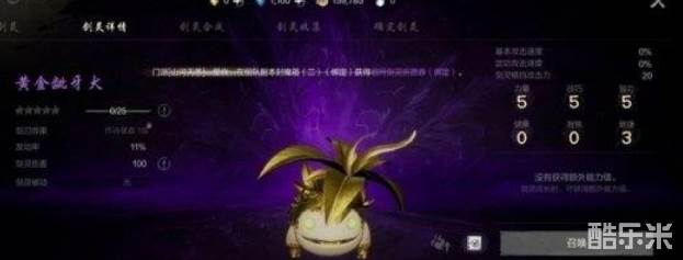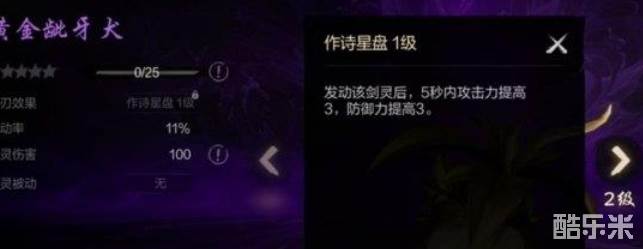 例如:剑灵【黄金龇牙犬】发动剑刃【作诗星盘】1级时,5S内攻击力提高3,防御提高3。