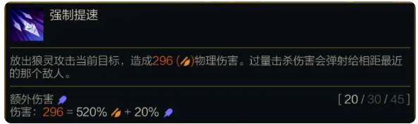 放出狼灵攻击当前目标,造成(520%攻击力 + 20%/30%/45%法术强度)物理伤害。过量击杀伤害会弹射给相距最近的那个敌人。