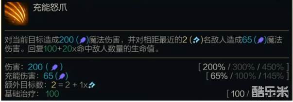 对当前目标造成200魔法伤害,并对相距最近的2名敌人造成65魔法伤害。回100+20x命中敌人数量的生命值。