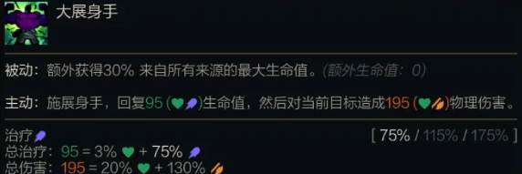 被动是额外获得来自所有来源的最大生命值。主动是回复生命值然后对当前目标造成物理伤害。