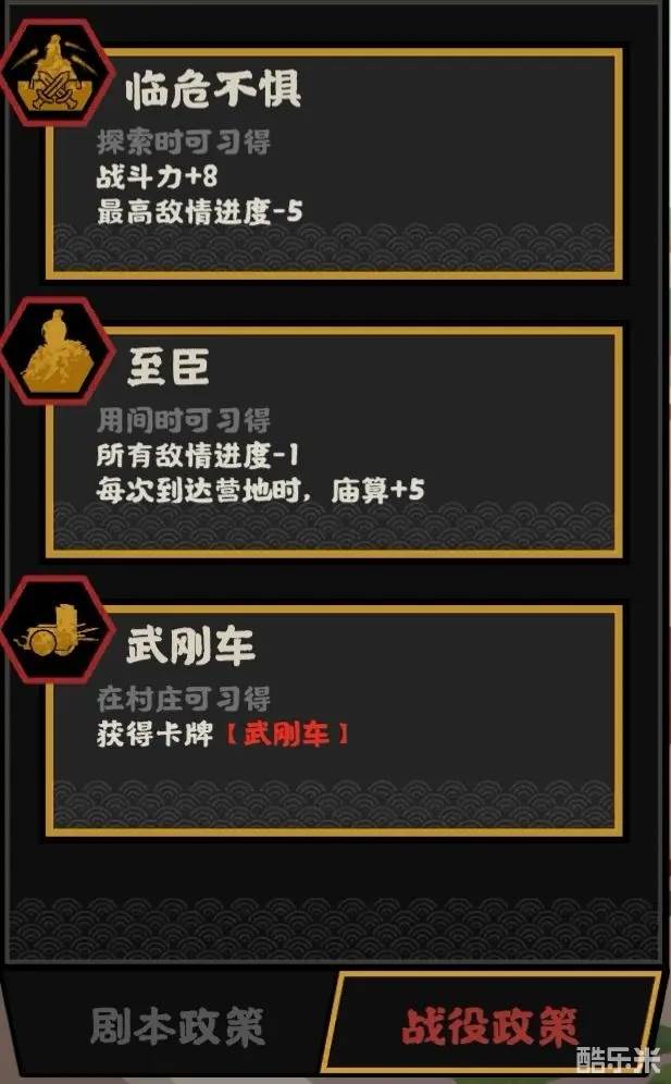同样也属于核心政策之一,当然,前提是你不是骑兵爱好者(因为武刚车速度确实很慢…),可以搭配弓兵、步兵、枪兵这类慢速兵种。