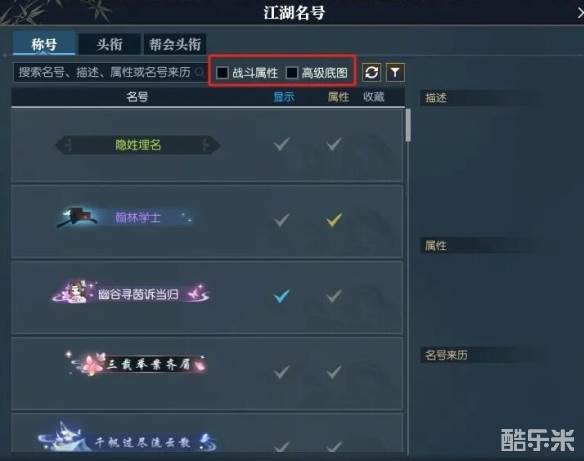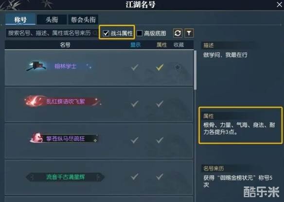 2、点击界面上方的【名号】进入【江湖名号】界面,勾选【战斗属性】;