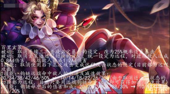 具体细节小编就不多说了,大家可以看一下文字,取消了普攻3次必定暴击的设定改为了25%概率;然后钩镰命中目标后的伤害加成也降低了一半,基本上是接近平庸了。