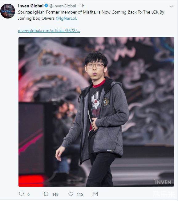 根据韩媒InvenGlobal消息,与Misfits的合同到期后,辅助选手IgNar将要加盟LCK的bbq Olivers战队。