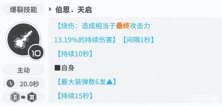 第2个技能战场火焰,对攻击范围内的敌人造成伤害。爆裂技能,对攻击范围内的敌人造成伤害和烧伤效果,同时自身最大装弹数提升,持续15秒钟。虽然这些技能都是和伤害相关,但实际应用中的表现可能会令大家比较失望。根据游戏在实战中的表现,这名角色虽然立绘方面设计的比较出色,但是实际表现却较为平常,尤其是需要花费很长时间才可以获得。
