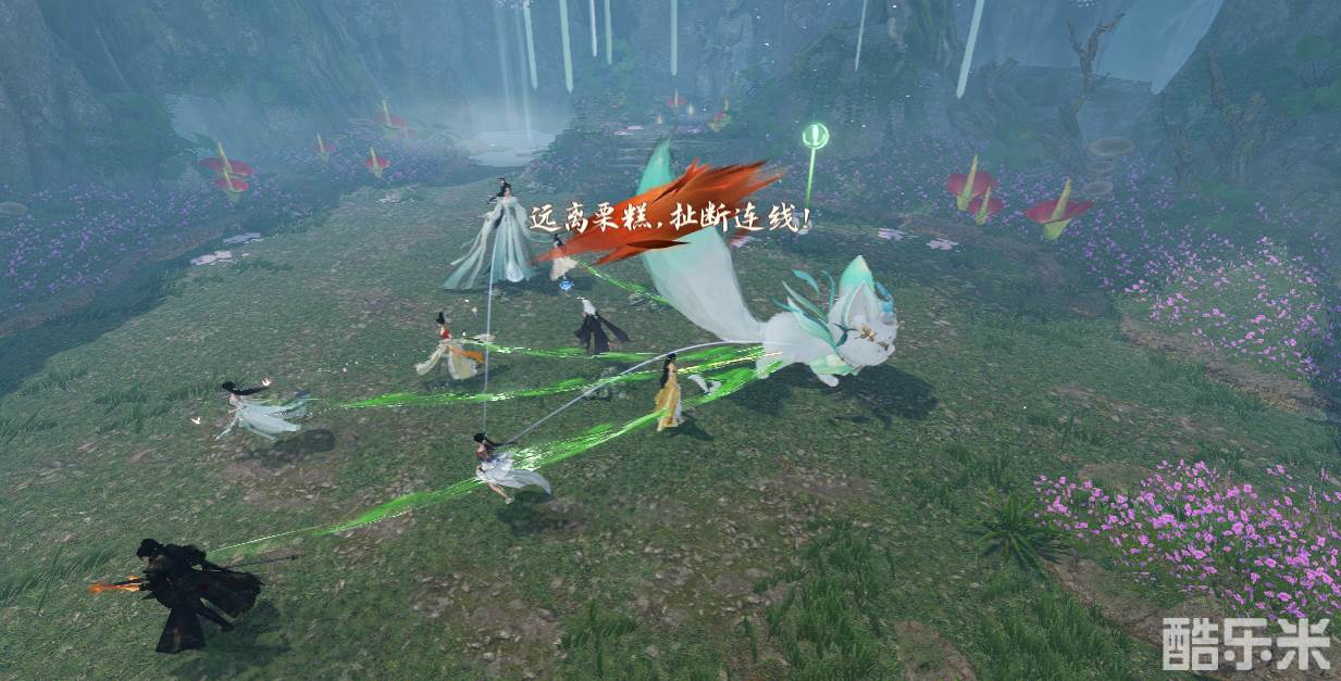 2、【执手天涯】:孙白微会对栗糕和全场玩家释放“执手天涯”,需要玩家朝场地一侧投掷雪涧草球吸引栗糕,然后迅速朝反方向跑动从而拉断约定线。否则玩家和栗糕处在约定连线状态下5秒后会根据连线人数持续回血,而处于连线状态的玩家也会受到持续伤害。
