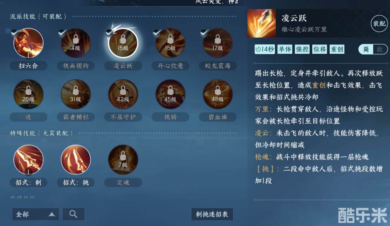 凌云跃:极为强大的一个技能,拥有多种技能效果。本身是一个强控制技能,也能够用来帮助玩家进行位移。作为一个单体技能,它所能够造成的伤害非常可观。