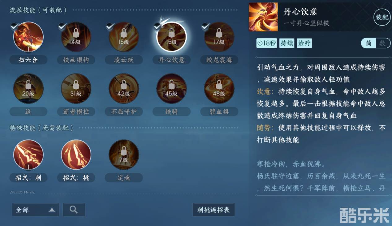 丹心饮意:带有一定减速效果的辅助型技能,在对周围敌人造成持续伤害的同时,可以治疗自身并偷取敌人的轻功值。