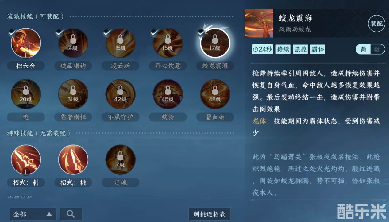 蛟龙震海:强大的控制技能,命中的敌人越多自身回复的气血就越多,技能持续期间附带的霸体效果可以有效抵挡的控制技能。
