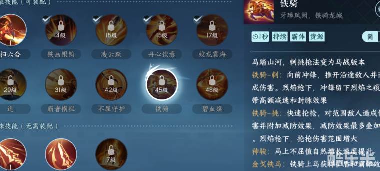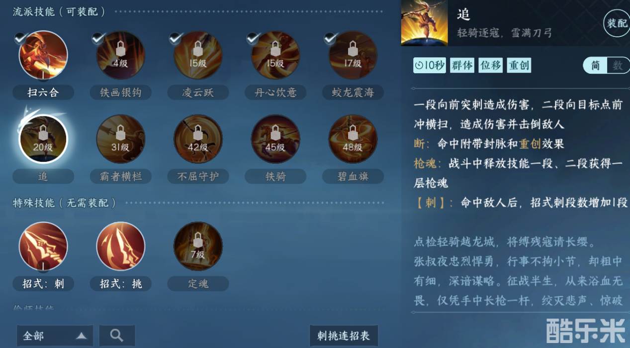 铁画银钩:爆发伤害技能,与刺挑连招搭配使用可以造成更多的伤害。