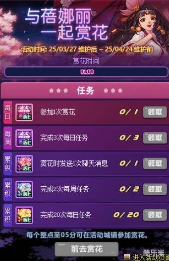 完成地下城与勇士与蓓娜丽一起赏花活动即可获得大量奖励,那么该活动内容有什么呢,在赛丽亚旅馆【蓓娜丽】处即可进入活动场景,每个整点赏花观景台将开启5分钟的赏花,参与赏花即可完成每日任务。接下来酷乐米小编给大家带来了详细的《地下城与勇士:起源》与蓓娜丽一起赏花活动介绍!