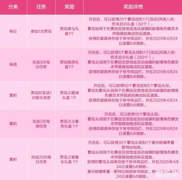 1、在赛丽亚旅馆【蓓娜丽】处即可进入活动场景,每个整点赏花观景台将开启5分钟的赏花;
