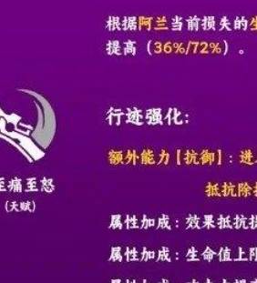 4、天赋 - 至痛至怒:根据阿兰当前损失的生命值百分比获得伤害加成,损失生命值越多,增伤越高。加成基于实时血量计算,例如天赋满级至多72%增伤,若血量损失50%,则增伤36% 。