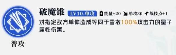 1、普攻 - 破魔锥:对单体造成100%攻击力的量子伤害,主要用于战技点不足时补刀、打点循环以及叠1层「恶报」,升级提升伤害倍率,前期可点到4级 。