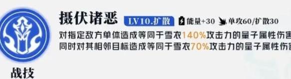 2、战技 - 摄伏诸恶:对指定目标造成140%攻击力伤害,对相邻目标造成70%攻击力伤害,能有效扩散打击。攻击主目标削韧60(叠2层「恶报」),副目标削韧30(各叠1层「恶报」) ,面对3个弱点目标单次可叠4层,是叠层的重要手段。升级提高倍率,前期点到8级,后期点满。