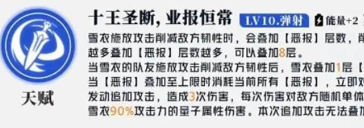 4、天赋 - 十王圣断,业报恒常:雪衣或队友造成削韧时叠加「恶报」,非满魂上限8层,满魂6层,满层触发追加攻击,追加攻击3次,每次削韧15并回2点能量 。升级提高追加攻击倍率,前期点到8级,后期点满。