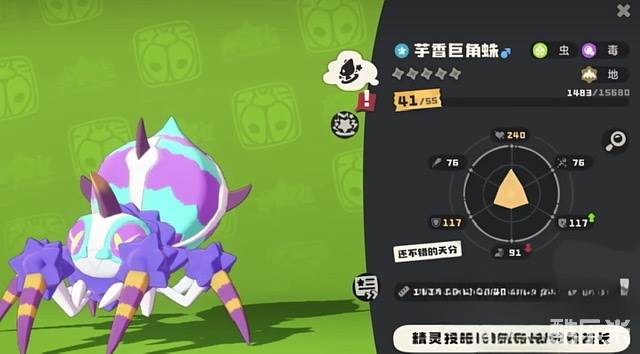 芋香巨角蛛的种族值总和为594,其中生命值高达135,为它奠定了强大的生存基础。物理和魔法防御分别为109和106,使它在面对多种攻击类型时都能保持稳定。虽然物攻和魔攻均为72,但它的核心输出并非依赖直接伤害,而是通过技能对敌人造成持续的生命百分比削减。速度值100则确保它能迅速行动,为队伍争取主动权。这样的属性分配让芋香巨角蛛成为一只兼具防御与消耗能力的宠物,特别适合在持久战中发挥作用。