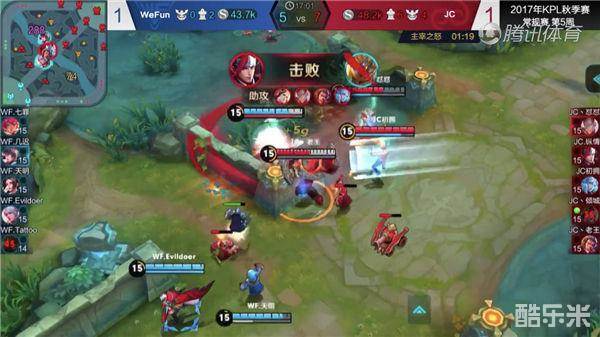解析:比赛进行到19分钟左右,此时已到达大后期,红方凭借前中期累积的优势,快速拿下了敌方上下路高地塔,红方再次集结准备对中路高地塔发起进攻,蓝方已没有退路,只能被迫上前防守,但双方的差距悬殊,蓝方鬼谷子竭尽全力控制红方多名英雄,但由于蓝方输出未及时跟上,从而被红方韩信等其他英雄集火击杀,蓝方节节败退,直接三路告破,随后红方一波推进直接赢得了比赛的胜利。