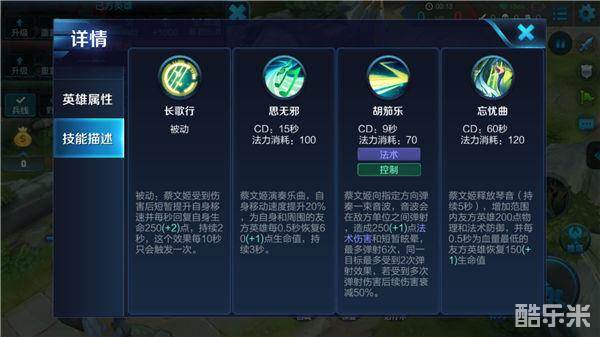 一技能-思无邪:蔡文姬演奏乐曲,并提升自身的移速,同时能为范围内的友军持续恢复生命值。