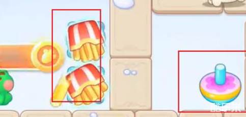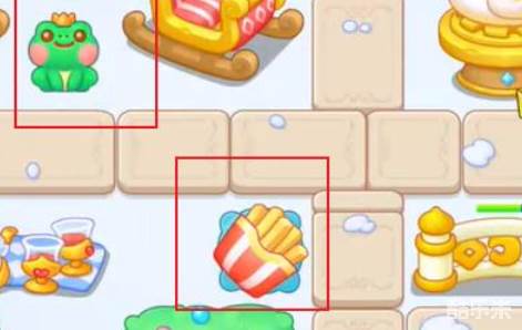 2、首先升级左侧的薯条,然后在其左上方放置一个青蛙炮塔。