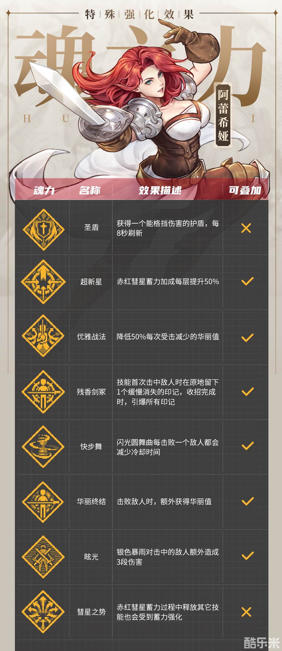 银色闪光掠过,守卫应声倒地,阿蕾希娅面无表情,朝着熟悉的宫殿大门走去。她曾作为首席骑士追随在公主塞拉芬娜的身后,如今两人形同陌路,一场恶战在所难免。接下来酷乐米小编给大家带来了详细的《战魂铭人》阿蕾希娅技能介绍!