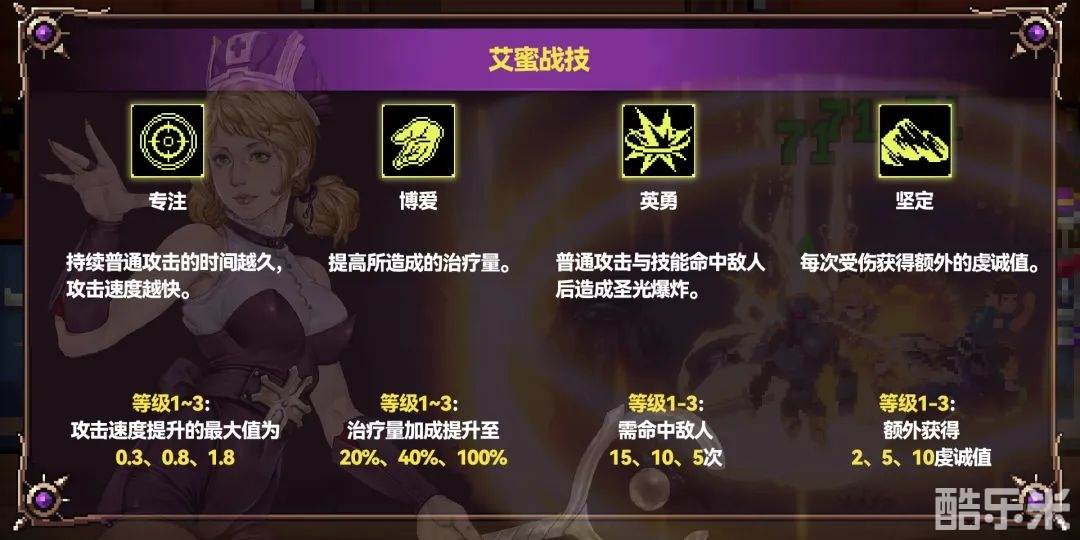 艾蜜的四个战技为:专注、博爱、英勇、坚定。