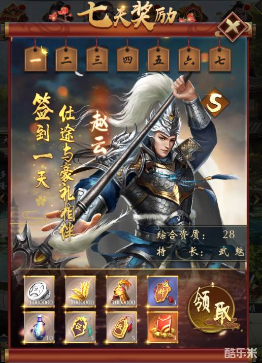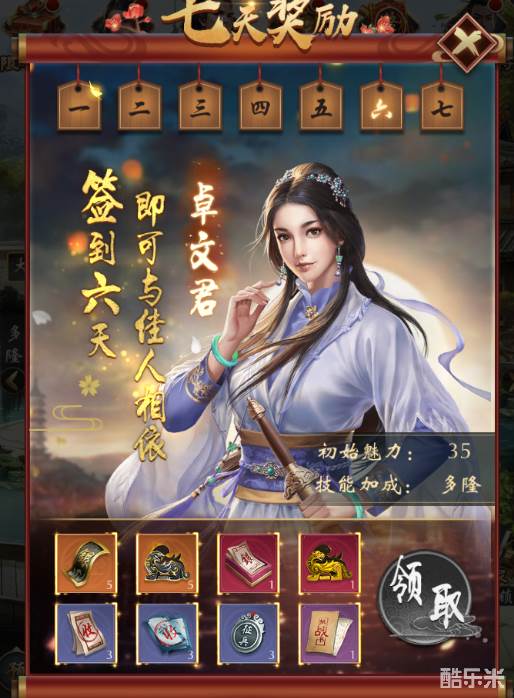 2、登录七天领取海量道具礼包,五虎上将,佳人卓文君,登录七天可号令传奇人物海大富
