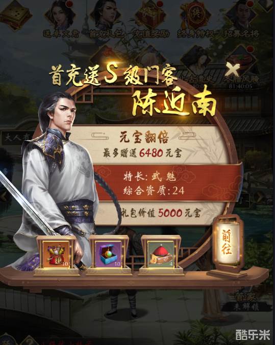 1、首充任意元宝,可领取s级门客陈近南,以及大量资源道具助力开荒
