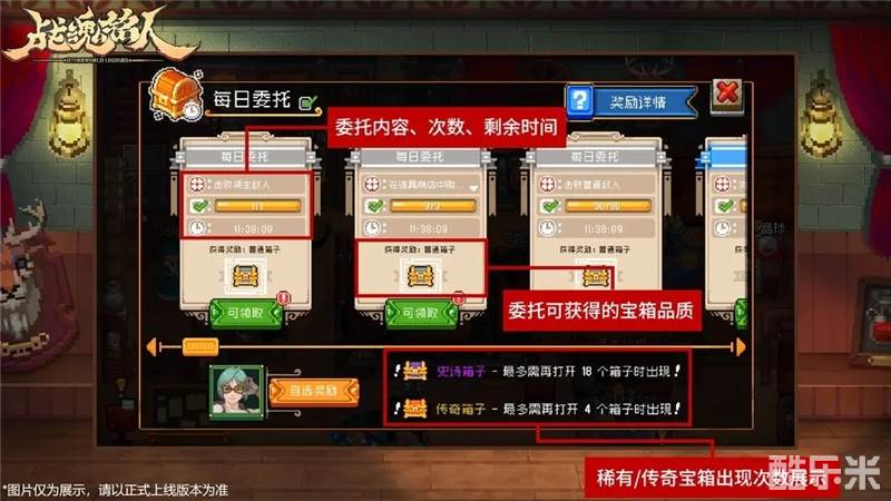 玩家可以通过完成委托任务来开启宝箱或使用“委托碎片”来获得英雄和皮肤。