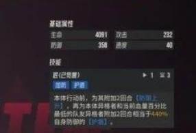 本体行动前,为其附加2回合[防御上升],再为本体异格者和当前血量百分比最低的队友异格者附加2回合相当于440%自身防御的[护盾]。